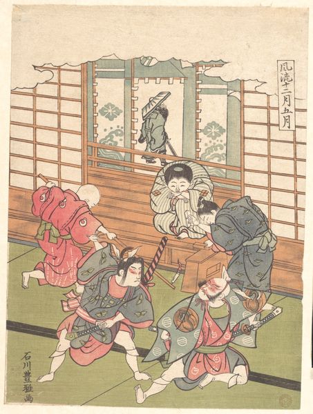 Editor: Here we have Hiroshige's "Act VII," a color woodblock print from around 1843-1846. I find the contrast between the indoor scene and the nighttime exterior quite striking. What are your initial thoughts when you look at this work? Curator: It's interesting to consider this ukiyo-e print in terms of its production. Woodblock printing was a collaborative process involving the artist, block carver, printer, and publisher – each contributing to the final product. Consider the materiality – the paper, inks, and the very wood of the blocks. How did the inherent limitations and possibilities of these materials shape the artist's choices and the viewer's experience? Editor: So you are looking at the print from the point of view of the production process and materials involved. Interesting! Is it something like mass production because many prints can be obtained using the woodblocks, and this might affect how we understand it? Curator: Precisely! Ukiyo-e prints were, in their time, relatively affordable and accessible, a form of mass-produced imagery. This challenges traditional Western notions of art as unique and precious. Thinking about it in terms of social consumption—who was buying these prints, and what desires and aspirations were they fulfilling? What does that accessibility say about the social function of art? Editor: It sounds like it's important to consider who these prints were for, like everyday people and not just wealthy patrons. I see how looking at art through this material lens can help us think about the artwork differently. Curator: Exactly! Examining the materials, processes, and consumption allows us to understand its value beyond aesthetics alone, revealing social and historical context.