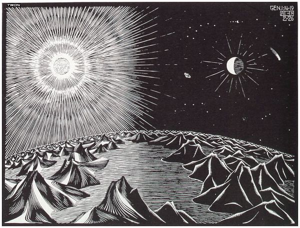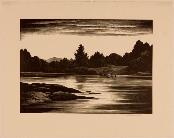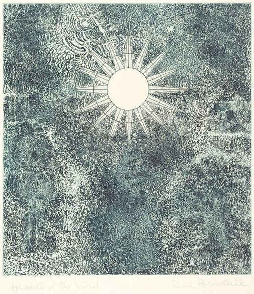 Curator: Claire Van Vliet’s 1971 graphite print, titled "North", depicts a serene landscape with an interesting tonal range. Editor: Immediately, I'm struck by how somber yet luminous this piece is; the contrast between the heavy darks of the forest and water, versus the bright sky, creates an intriguing visual push and pull. Curator: I agree. It's also tempting to explore "North" through a contemporary lens, positioning its thematic concerns within conversations of environmental justice. The title implies not only geographical location but perhaps an uncharted future—given the oil spills off the coastlines near the artist’s residence. What are your thoughts? Editor: An interesting proposition, certainly. And that thematic approach would tie into her practice of merging text and image, imbuing nature with layered meanings. Yet, the graphic handling itself draws the eye into a purely visual assessment. Consider the lines used to evoke texture— the water especially. And also the interesting bright halo dominating the landscape—its radiating pattern creating an otherworldly feeling. Curator: You're right, I think the piece engages with multiple interpretations. The landscape could also symbolize a longing for place or a contemplation on the loss of homelands within conversations surrounding indigenous rights and access to water. Editor: Perhaps so. However, the overall formal effect underscores its ability to stand on its own merits. The carefully observed nuances make a compelling study in contrasts. And in how light interacts with texture— regardless of location or any political narrative that you might assign to the subject depicted. Curator: Indeed, these artistic choices encourage us to see “North” as something more than merely a geographical space— as a dynamic locus where the past and present converge, urging introspection and inspiring socio-political imaginaries within broader art conversations. Editor: A powerful assertion; either way, this invites more conversations to decode meaning through composition.