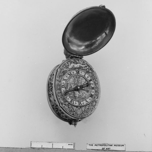 This watch was made by Jaques Sermand, probably in Switzerland, out of silver and glass. The first thing to notice is the intricate ornamentation, achieved through hand-engraving. Look closely at the bezel, the hinged cover, and the dial itself. This kind of watch was a luxury object for the elite. The silver case would have been cast, then meticulously chased and engraved, requiring a goldsmith’s level of expertise. The glass covers, both on the front and back, would have been carefully ground and polished. Note the painted landscape on the dial! And of course, the watch's movement is a feat of precision engineering – requiring highly skilled labor to assemble. The value of this object, then, lies not just in its precious materials, but in the sheer amount of work involved. It is a potent symbol of wealth, and the means of production at the time. Considering such an object invites us to think about labor, class, and the history of technology.