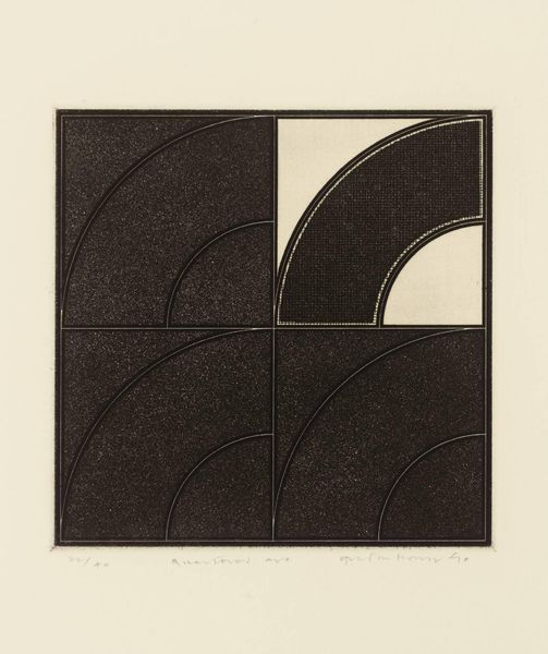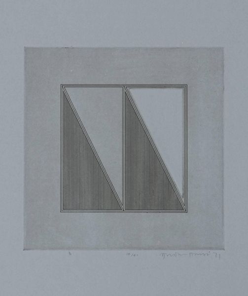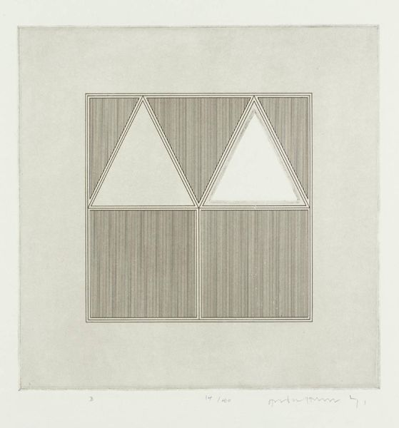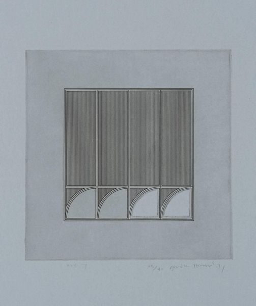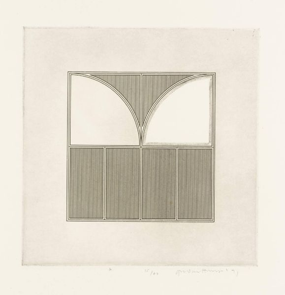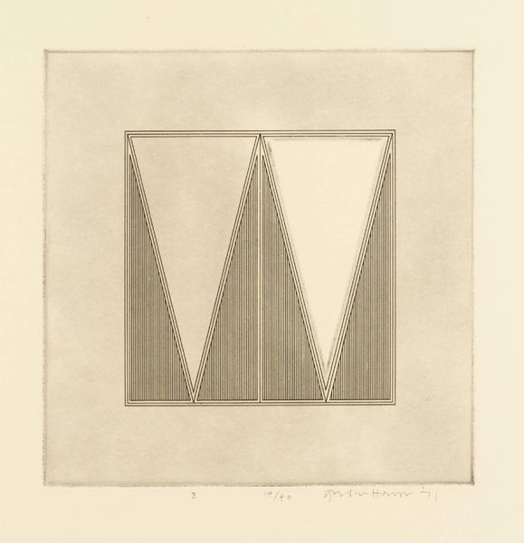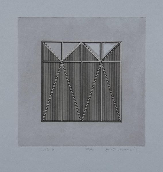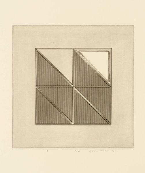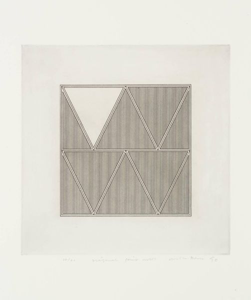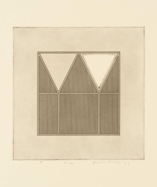 Curator: This is Gordon House’s "Triangles within a Square," an etching made in 1971. I’m struck by its quiet precision. Editor: The etching’s monochrome palette and geometric forms feel very controlled, almost like a blueprint. The vertical lines within the square remind me of threads in fabric. What do these shapes evoke for you? Curator: I see a subtle play with positive and negative space. The triangles can symbolize aspiration and stability, but inverted, they become symbols of instability. Editor: Interesting. Etching, as a process, is all about controlled destruction of a surface to create an image. This interplay between control and accident is so compelling. Curator: Yes, the controlled geometry contrasts beautifully with the nuanced tones of the etching. Editor: Ultimately, it's a testament to the beauty achievable through meticulous labor and simple materials.