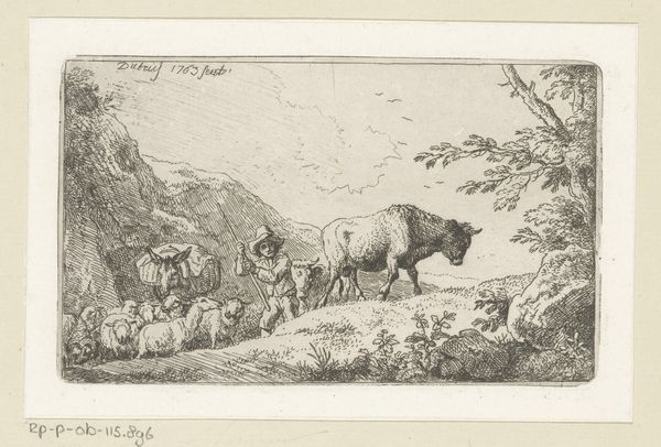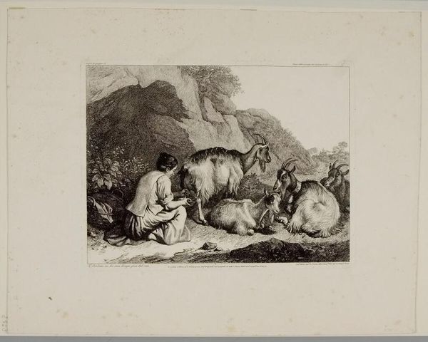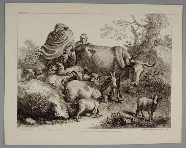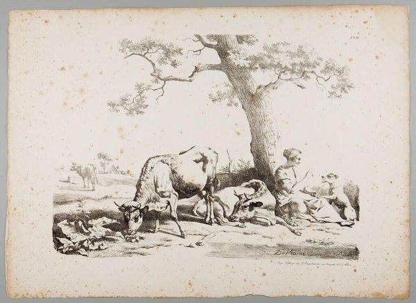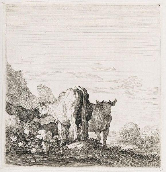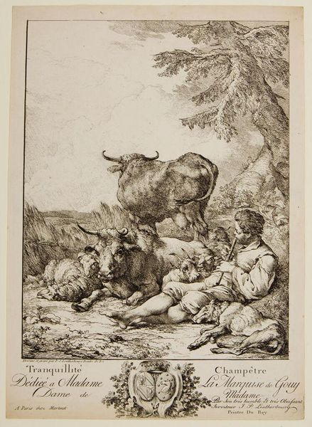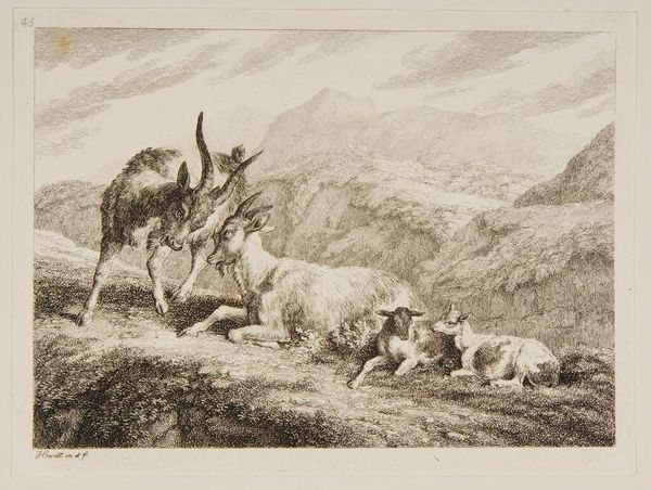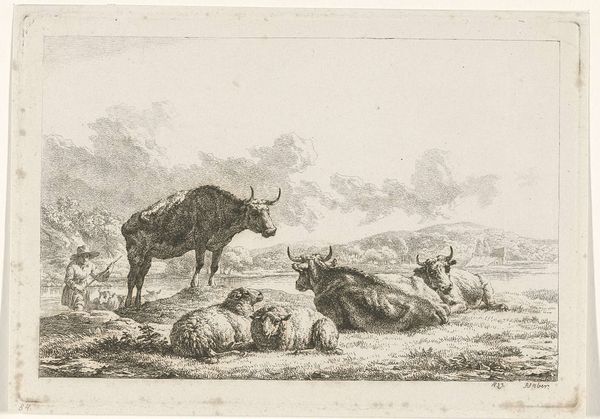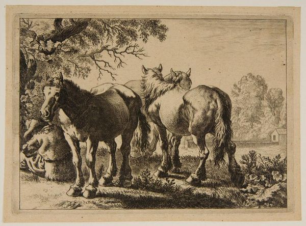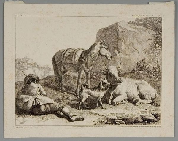Editor: This is "Horse and Cattle" by Johann Elias Ridinger. The etching shows farm animals resting, seemingly exhausted. What strikes me is the rendering of the animals; they almost appear manufactured, or at least carefully bred. How might Ridinger’s methods and the social context of this work inform our understanding? Curator: The etching process itself – the acid biting into the metal, the controlled lines – mimics the controlled breeding and commodification of these animals. Consider the labor involved in producing both the artwork and the livestock. They're products of their time, aren't they? Editor: That's a great point; both are made through meticulous processes. I never thought about it that way. Curator: It challenges our typical romantic view of pastoral scenes, showing a much more calculated and transactional reality.