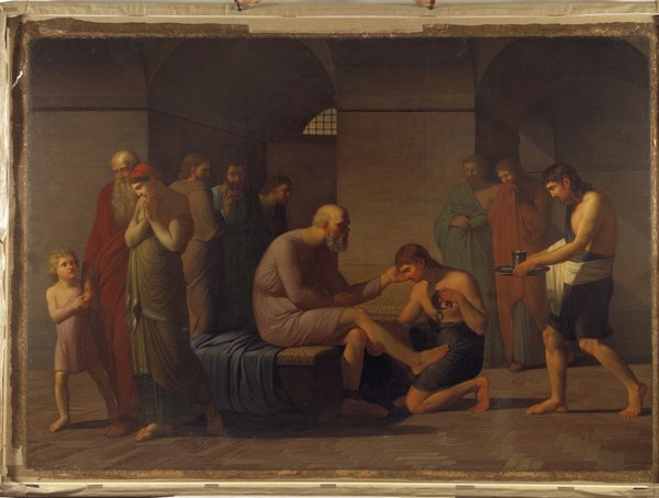 Curator: This is Henry Thomson's "The Raising of Jairus' Daughter." What strikes you most about it? Editor: It's quite large, and the scene feels very theatrical. I'm curious, what is the historical context of depicting women this way, as passive and needing to be saved? Curator: The painting reflects a patriarchal societal structure where women's agency was suppressed, their roles often confined. Thomson's representation invites us to examine how power dynamics shaped artistic narratives, perpetuating gender stereotypes and limiting female representation. Editor: So the painting isn't just a religious scene, but also a reflection of societal norms at the time? Curator: Precisely. It's crucial to analyze the painting through an intersectional lens, considering gender, class, and the religious implications of a woman being brought back to life by a male figure. It prompts us to question whose stories are being told and whose are being silenced. Editor: That gives me a lot to think about regarding not only this painting, but also the art of that era. Curator: Indeed. Remember, art is never created in a vacuum.