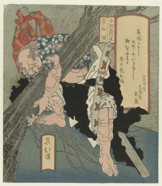 Kobayashi Kiyochika produced this woodblock print, likely in the late 19th century, showcasing a street performer in Edo. The process of creating woodblock prints, like this one, is incredibly labor-intensive. Each color requires a separate block, meticulously carved by hand. Notice how the artist used the qualities of the medium to evoke the textures of the performer’s costume and the surrounding environment. The vibrant red of the lion mask contrasts with the softer tones of the sky and landscape, achieved through the careful layering of ink. The crisp lines and bold patterns reflect the precision of the carving process. Woodblock printing was a highly developed craft in Japan. It allowed for the mass production of images, making art accessible to a wide audience. This print captures a moment of everyday life in Edo, highlighting the cultural significance of street performance and the skilled labor involved in creating these vibrant images. By appreciating the materials and making process, we gain a deeper understanding of the artwork's meaning and its place in society.