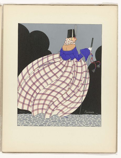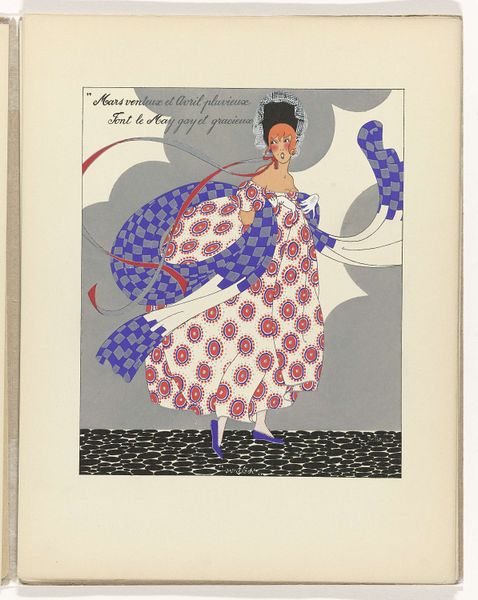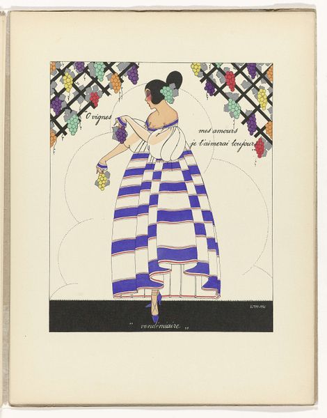 Editor: We're looking at "Les Douze Mois de l'Année: Messidor" by Marthe Romme, created in 1919 using watercolor. I'm struck by its almost dreamlike quality; the figure seems to float. How would you interpret this piece? Curator: Well, to start, the decorative art style, quite evident here, speaks to the post-World War I period, a time when artists turned away from stark realism, longing to embrace the idealized and the ornamental. Note the checkered pattern, her very stylized gown; what public anxieties or desires might these types of stylistic choices address, you think? Editor: I see what you mean, almost like a return to beauty and a sense of order after chaos? This piece feels quite disconnected from reality. Curator: Exactly. Art Nouveau, particularly, often represented an escape. This image being an illustration meant it was readily available via magazines, easily consumed. What does this ease of access suggest about the role of art in society at that moment? Also, observe that although she's offering the fruits, flowers and even her heart, there’s something undeniably commercial about her pose. It reminds me of an advertisement. Editor: Hmm, interesting! So, the artist could be both embracing beauty while simultaneously engaging with a growing consumer culture? Curator: Precisely! Her offering seems very symbolic, yet it's packaged in this highly stylized, accessible form for mass consumption. Understanding how social and cultural trends shaped art allows for a deeper connection. Editor: I hadn't considered the commercial aspect before. It's fascinating to think how something so beautiful could also be so tied to the socio-political environment of its time! Curator: It illustrates the way that art shapes, and is shaped by, society!