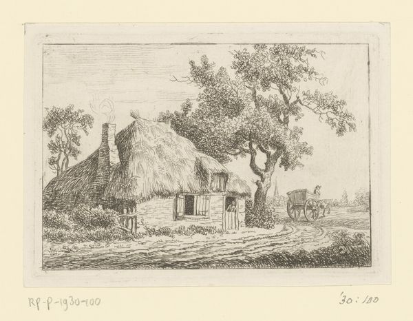 Curator: This etching, titled "Drie mannen voor een herberg" – or "Three Men Before an Inn"– is attributed to William Unger and believed to have been created sometime between 1847 and 1889. It’s part of the Rijksmuseum’s collection. Editor: It feels like peering through time. The light pencil work gives the whole scene an ethereal quality. A quiet stillness, a narrative only just suggested... almost like catching a half-forgotten memory. Curator: Indeed, the 'old engraving style' lends a certain gravitas. We see three figures in what appears to be a casual meeting, perhaps a negotiation, outside a humble-looking inn. A dog adds a touch of everyday realism. What I find interesting is Unger’s capture of this specific social dynamic. Inns, historically, were critical spaces for news, business, and community. Editor: It feels… comfortable? Though comfortable isn’t quite right. More like… unpretentious. I mean, the light seems to embrace everything, even that modest inn and the sketchiness adds intimacy, like we're looking at something private from someone's personal sketchbook. Did Unger intend for it to feel so… immediate? Curator: Unger was fascinated with Rembrandt, emulating his style in his etchings after earlier artistic efforts in lithography and even photography. He was invested in the revitalization of the etching technique, giving it the status it arguably holds today as an independent artform. He often used much older works as templates. So yes, while it conveys that intimate 'immediate' feel you identified, it does so referencing well-established tropes. Editor: And what of the setting, its composition? Curator: The positioning of the inn on the right, drawing our eye along that path from left to right, subtly emphasizes the narrative unfolding at the inn's doorstep. Genre painting in its truest form. He takes this relatively simple moment in time and turns it into something beautiful to look at! Editor: It almost feels like a snapshot, albeit one with very intentional composition, doesn't it? Unger managed to capture something beautifully universal within the mundane. I'm seeing how seemingly effortless drawings have historical stories beneath them.