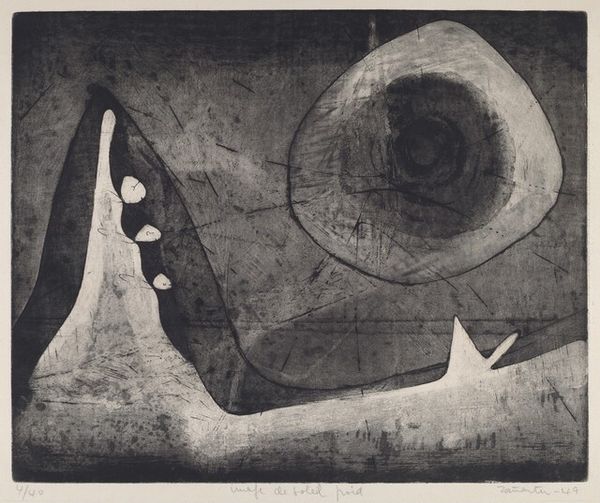 Curator: This is Emmet Gowin’s 1995 photograph, "Snow over Pivot Agriculture, near Liberal, Kansas." Editor: My first impression is of something massive, strangely scarred. The texture makes it feel like I’m looking at an artifact that has eroded away. Curator: Gowin is known for his aerial landscape photography, often capturing the impact of human activities on the environment. The circular patterns are the result of center-pivot irrigation systems, where a long sprinkler arm rotates around a central point. Editor: So, that circular pattern isn't naturally occurring, but a consequence of industrial agriculture? It’s both a testament to human ingenuity and a somber visual comment on environmental control. What’s compelling, materially, is the printing; I see how Gowin pushes tonality through these monochrome prints. Curator: Exactly. It’s almost a celestial map. The single black hole-like point draws the eye—a symbol of both a center and perhaps an absence or even loss? I think it encourages contemplation of the changing American landscape. Editor: The snow itself almost looks like a delicate coating on the earth, highlighting these almost alien-looking circular fields. This play with tone makes the actual printing feel monumental. It really forces me to consider the implications of land use in Kansas, down to the physical process behind producing it. Curator: The title tells us this aerial view is grounded, though: Liberal, Kansas. What readings and symbols might you bring from that name? Editor: Hmmm, well I find the starkness of this piece disquieting; it is not what I usually call beautiful. It challenges assumptions about what we extract from our land and its physical transformations. I now read those etched lines as akin to work markings from laborers or weathering of material used in a factory. Curator: Gowin captures both abstract beauty and an environmental story—allowing it to function as a symbol for larger issues facing rural America, and prompting questions about balance, and cost, as the piece enters the symbolic order. Editor: This is one that lingers in the mind long after viewing.