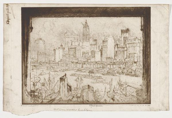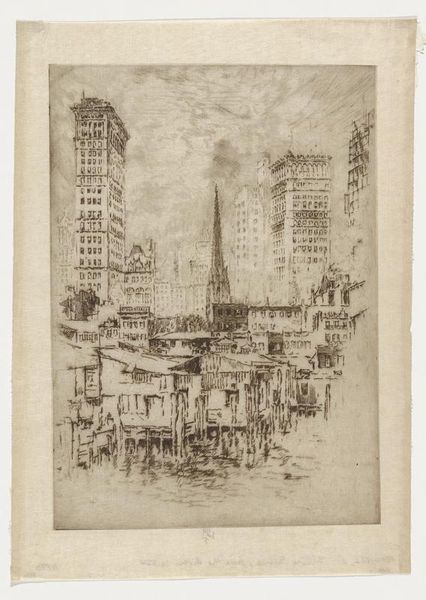 Joseph Pennell made this etching called ‘The Three Towers’ using black ink on paper. There’s something so immediate about the scratchy, hesitant lines of this piece. It’s like you can see Pennell working, changing his mind, unsure of the exact weight or placement of a line, which makes it feel very of-the-moment. Look at the way the buildings are rendered; they’re not solid, looming monoliths, but rather sketched, fragile forms. Pennell really captures the feeling of a city in flux, always changing, never quite fixed. See how he uses a kind of frenetic hatching to bring the lower levels into focus, while the tops of the towers are barely-there wisps of lines. This gives the whole image a sense of upward movement, of reaching for something just out of grasp. It makes me think of other artists like Whistler, who were also interested in capturing the fleeting impressions of modern life. Ultimately, art’s about embracing uncertainty, isn’t it? Leaving room for the viewer to fill in the gaps, to make their own connections.