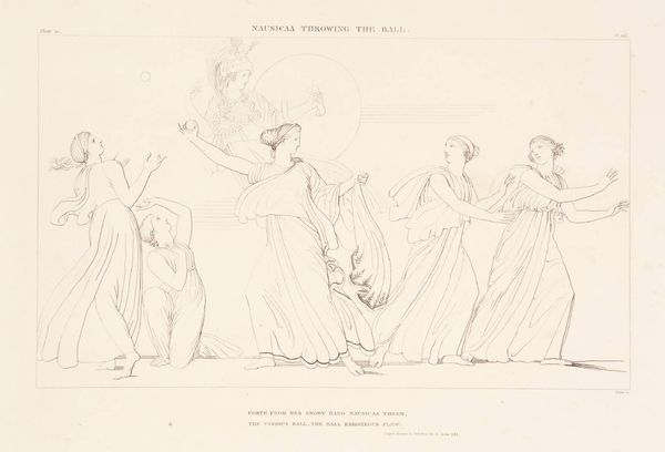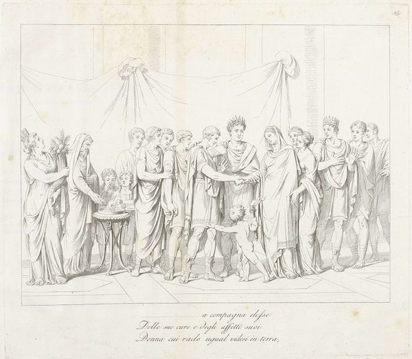 Curator: John Flaxman created this line engraving, "Nestor's Sacrifice," which is part of the Tate Collections. Editor: It’s airy, isn't it? Like a dream half-remembered. The figures are so gracefully positioned, almost floating. Curator: Flaxman was deeply influenced by classical antiquity. We can see that here through the emphasis on line and idealized forms. The narrative depicts a ritualistic offering, gesturing towards themes of devotion and perhaps supplication. Sacrifice as a cultural practice certainly carries a lot of weight when viewed through the lens of power dynamics. Editor: Right, you get that feeling, don’t you? The way the people are posed… they are submitting. It makes me think about the weight of tradition and the stories we tell ourselves about why things are the way they are. The clean lines almost mask the darker undertones. Curator: Absolutely. Flaxman uses this aesthetic to explore complex societal structures. The drawing invites us to consider the roles of gender, power, and faith within ancient Greek society. It highlights how these elements are constructed, maintained, and, at times, challenged through symbolic actions. Editor: It’s funny, isn’t it? How something so simple can hold so much. Makes you think about the sacrifices we make, both big and small, to fit in, to belong, or maybe just to survive. It’s really quite profound when you think about it.