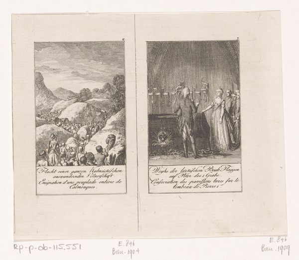 This print, made by Daniel Nikolaus Chodowiecki, likely in Germany during the late 18th century, depicts three scenes from the history of the Crusades. The visual codes here reflect a moment of intense religious and political fervor, with the imagery creating meaning through cultural references to medieval Christian narratives. Consider the figure of Peter the Hermit, featured here, who preached the First Crusade, or Peter Bartholomew, who claimed to have discovered the Holy Lance. These figures are presented as divinely inspired leaders, embodying the religious zeal that fueled the Crusades. This artwork offers a window into the way historical events are shaped and interpreted through art. It reminds us that history is not a fixed narrative, but rather a collection of stories shaped by cultural beliefs and power dynamics. To understand it better, one might consult primary sources from the Crusades, theological texts, and studies of popular religious movements of the period.