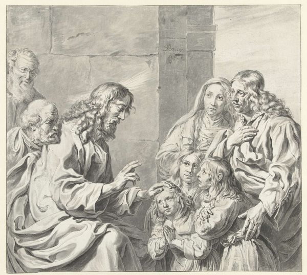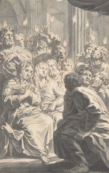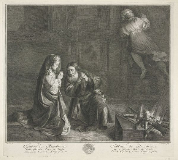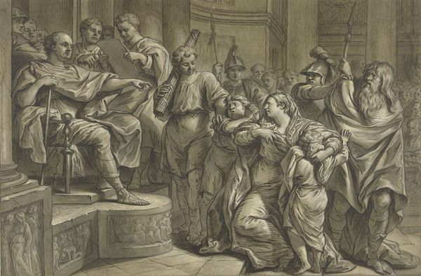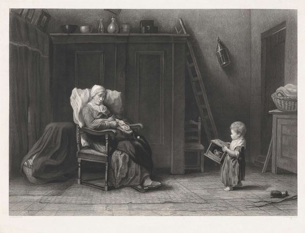 Editor: This is "Waiting for the Verdict," an engraving by W.H. Simmons after Abraham Solomon. It’s incredibly moving; the figures convey such palpable anxiety. What strikes you most about the composition? Curator: Note the artist’s strategic use of chiaroscuro, the stark contrast between light and shadow, to intensify the emotional weight. Observe how the artist directs our gaze through a series of carefully arranged forms, leading to the distant figures awaiting news. Editor: The way the light falls on some figures and not others adds to that feeling of tension. Curator: Precisely. The lines are distinct, yes, but that soft gradation of tone lends the work an almost haunting quality. The formal elements mirror the psychological drama. Editor: I hadn't considered how the light reinforces the tension. Thanks for pointing that out!