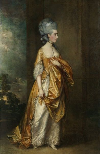 Editor: So, here we have Joshua Reynolds's portrait of *Elizabeth Gunning, Duchess of Hamilton and Argyll*, painted around 1760. The oil on canvas… It’s giving me neoclassical statue vibes, like a modern goddess casually posing in her garden. What stands out to you the most when you look at this piece? Curator: Oh, definitely the theatricality! Reynolds, bless his heart, was always trying to elevate his subjects. But it’s more than just flattery, isn’t it? He's composing a *narrative*. Look at her dress, so simple, almost Grecian, yet she's draped in ermine. Does this suggest the Duchess felt somewhat conflicted by her status, as if burdened by her duties? Maybe even suffocating with wealth? Editor: That’s a really interesting point. I hadn't considered it that way, I was just focused on her poise. Curator: Consider that classical sculpture carved into the stone she leans against. Think it is referencing a moment of deep meaning, and how does her dress play in this game? She must have really enjoyed making sure the scene was perfect. What feelings do you see here, the contrast of duty versus relaxation? How has this artist woven a deeper theme into his art? Editor: It makes me think of how portraiture can be so much more than just a likeness, you know? It can tell a whole story! And, also now that you point out those questions, that the lady chose for them to be presented there and perhaps thought deeply about it is making me wonder of many meanings! Curator: Exactly! These artists made statements through imagery, and these objects, which serve as props within an artistic expression, convey sentiments that have existed in their and possibly our minds! And it’s fun to tease out what exactly those are! It almost encourages deeper discussions with someone’s inner mind to look this deeply at any moment that happens with the artist. Editor: I guess I'll have to try thinking that way more often when engaging with art! Thank you!