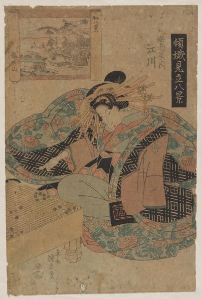 Curator: First impressions—chaos! There's a nervous energy in the figure and the sheer volume of paper. It's almost dizzying, a festive panic of getting ready. Editor: You've picked up well on the chaotic feeling. What we have here is a woodblock print by Utagawa Kunisada. It's thought to have been produced sometime between 1820 and 1840, and is titled "Ichikawa Danjūrō VII Preparing New Year's Gifts." It now resides at the Metropolitan Museum. Curator: So, that flurry of papers becomes gift wrapping supplies then? He’s like a feudal Santa Claus with anxiety, I imagine. I feel like I recognize that actor, too! Editor: Ichikawa Danjūrō VII was a prominent Kabuki actor during the Edo period. These prints were hugely popular as collectibles and kind of served as publicity material for the actors. In some cases they immortalized roles or even documented their daily lives, so that makes it quite different to old Saint Nick's tale. Curator: Ah, so like a magazine spread. He's captured with all these details, though. I get this overwhelming feeling he is just overwhelmed, right at that instant, like it was the biggest moment ever. Look at the color choices too! Editor: The style is very typical of ukiyo-e prints, known for their bold outlines and flat planes of color. But I do see what you mean about it all converging, that anxiety becomes something else: he embodies Japan at that moment! His outfit blends in as does the room. Curator: It is so intimate, to get this behind-the-scenes glance into his preparations. A glimpse of this guy and all his fame just sat preparing. But his concentrated expression humanizes him, makes him somehow touchable despite his status and that mountain of gifts he probably owes to everyone. Editor: And this image participates in that very public performance of his identity. Kabuki itself involved audience participation, with spectators shouting out stage names or praising particular scenes. Curator: So, a collective creation almost, the artwork, the actor and the public together, everyone shaping everything at once! Editor: Precisely, and that speaks to the fascinating and layered relationship that these woodblock prints helped foster. Thank you so much for being here! Curator: Anytime. Always wonderful to find myself pleasantly lost in these fascinating artifacts and their world.