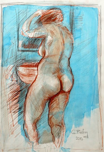 Gazmend Freitag's "Nude in bathroom 1," made in 2013, looks like it was drawn with some kind of brown ink. It is a drawing that lets the hand be the guide. The ink washes in this drawing feel really intimate, like they're whispering secrets about the body. You can almost feel the slippery tiles of the bathroom. The lines aren't precious; they're more like a map of the artist's looking. See that one long stroke defining the curve of the back? It’s so confident, like the artist just *knew* exactly where it needed to go. I am reminded of some of the drawings by Egon Schiele, who also had a very similar kind of raw energy. Both artists make you feel like you're seeing something vulnerable and real, not some airbrushed ideal. In art, the unexpected is often more interesting than perfection.