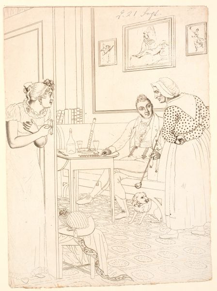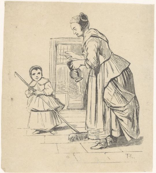 Curator: Welcome. Let's explore "Meisje met een lam van boter," or "Girl with a lamb of butter," a pen and ink drawing on paper, crafted sometime between 1885 and 1938 by Gillis Bernhard Mulder. Editor: My first impression is that there's a whimsical, almost dreamlike quality. It's a domestic scene, yet there's something very odd and playful about it, wouldn't you agree? Curator: Precisely! The imagery evokes familiar motifs found in Dutch genre painting, depicting a mother looking at her daughter holding what looks to be a small lamb carved of butter, displayed almost reverently. What draws you to the deeper narrative? Editor: Well, looking through a feminist lens, the division of space and labor is immediately apparent. We have a woman elevated on what appear to be stairs, removed and with cleaning gloves in hand, and below her a young girl bringing her something precious: food presented almost religiously! What roles does each of the female subjects inhabit? What societal burdens or expectations might it express? Curator: Yes, those are valid considerations. We see a girl enacting this ceremonial behavior, perhaps mirroring an ingrained expectation, performing in the style of her older mother's "burden of cleaning," a societal trope indeed. Mulder carefully selected a potent symbol. Butter has long signified prosperity. It could signify status, tradition, and hidden messages in plain view. Editor: The seemingly banal domesticity makes it even more compelling! By centering this act within the context of domestic life, it highlights how such performances, so rooted in ritual, contribute to larger narratives about female labor, even domestic symbolism. The very choice to use butter—so perishable—introduces ideas around sustenance, but also the fragility of our notions. Curator: Indeed! Mulder cleverly employs seemingly simple iconography to subtly challenge existing ideologies within that home. This seemingly innocent act transforms to questions on traditions. Editor: It leaves you wondering what other symbolic charges lie just beneath the surface of the drawing itself. The context transforms what could otherwise be easily disregarded or glossed over! I can't help but feel like these kinds of subtle sketches give insight into larger ideas regarding intersectional views in art and cultural discourse. Curator: An apt reading, yes! Mulder invites viewers into an intimate, intriguing conversation far exceeding its modest medium and mundane scene. It's these layers that invite contemplation and debate. Editor: Yes. And perhaps invite all to revisit how the familiar, too, is ever fraught and worth a second look.