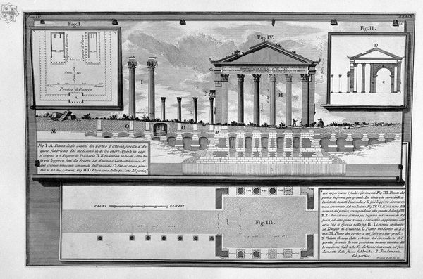 Curator: Giovanni Battista Piranesi's "The Roman Antiquities, t. 4, Plate XL. Surplus of the front interior of the Portico of Octavia, his section, foundation and construction details"—quite a mouthful, isn’t it? Editor: My first impression? Rigor. It feels less like gazing at antiquity and more like meticulously dissecting it. Almost surgical in its precision, yet with this strange sense of looming ruin... Curator: Indeed! This piece is a print, a drawing and an engraving all at once. Look at how Piranesi blends architectural precision with this almost romantic vision of decay. He’s documenting, but also… feeling. Editor: He’s an archaeologist with a printer's eye. Think about the layers here—the raw stone transformed by human labor, translated into a drawing, then reproduced as an engraving for mass consumption. It abstracts the original process of production but immortalizes a cultural treasure of humanity... Curator: Absolutely. This image, in its precise detail, isn't just about documentation. The geometric precision you pointed out transforms into something poetic, almost melancholic. It speaks to time's relentless march, how even the grandest designs eventually crumble. It’s the feeling that's stuck with me through my art studies! Editor: And what materials did he use? Ink, paper, metal plates, and his burin. Those things were the vehicles through which classical ideals about power and empire circulated to contemporary Europe. The process speaks just as much as the image does. The consumption and making of art meet the human need for wonder in its presence. Curator: So true; that really resonates. Looking at it now, I see less the crumbling stones and more the enduring human need to understand and connect with the past, however fragmented it may be. It becomes more of a conversation between then and now...a human continuum of art and meaning. Editor: A continuum sustained by the very materials we hold in our hands today, wouldn't you agree? Piranesi gives us not just history, but the concrete means of encountering it. And what a gift!