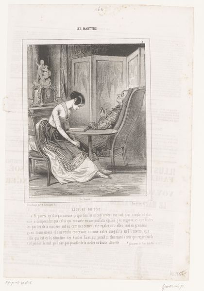 Paul Gavarni created this print, now in the Rijksmuseum, using lithography. Here, we see an elderly woman addressing a dog in a bed. The dog, elevated to the position of a spoiled child, is a powerful emblem of changing social attitudes. Consider the motif of the domestic animal given human-like status; it echoes in ancient Egyptian art with deities depicted as animals and in classical myths like Cerberus. This elevation isn't merely whimsical; it signifies a deeper psychological shift. Animals often become surrogates, reflecting our anxieties and desires onto them. Throughout art history, the act of endowing animals with human traits has served as a projection screen for our deepest emotions. Gavarni’s portrayal of the dog taps into this long, cyclical tradition, where the animal represents a unique blend of companionship and emotional complexity. It reminds us of the continuous evolution of symbols, adapting to reflect our ever-changing inner lives.