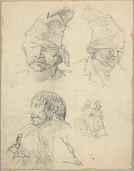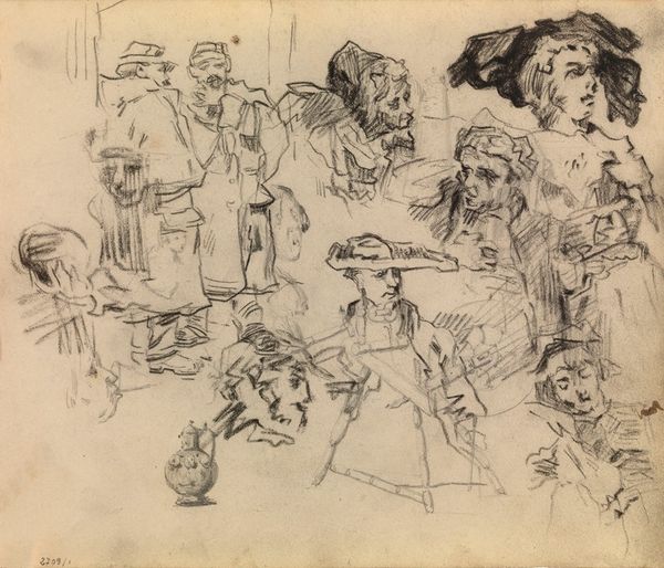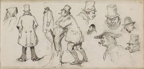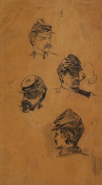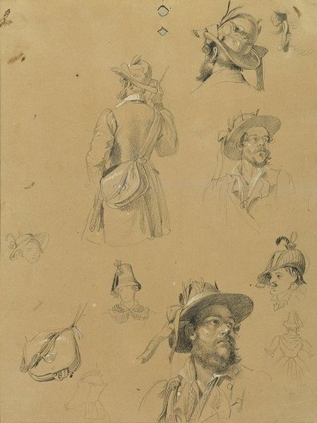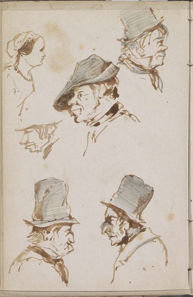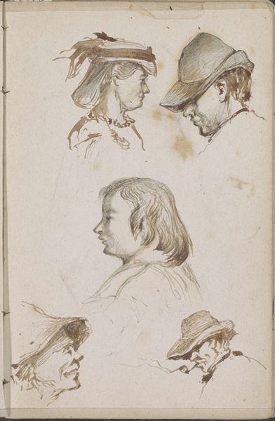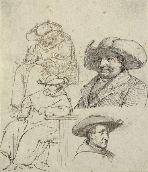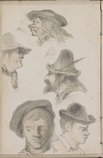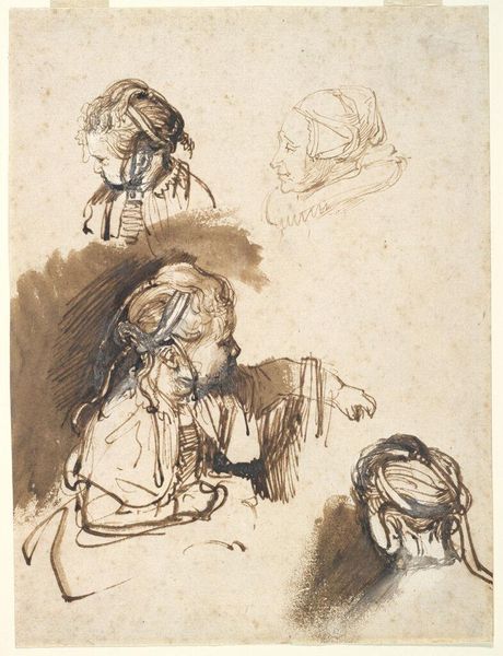 Editor: This is Rembrandt's "Four Studies of Male Heads," and I'm struck by the variety of head coverings. What do you see in these studies beyond mere portraiture? Curator: Consider the turban. It appears repeatedly in Rembrandt's work. These aren't simply fashion statements; they evoke the "Orient," a realm of exoticism and biblical history, filtered through a European lens. The turban becomes a signifier. Editor: So, it's about more than just depicting different people? Curator: Exactly. It's about imbuing these figures with layers of meaning. Rembrandt uses these visual cues to tap into collective cultural memory, hinting at stories beyond the immediate image. What stories do they tell you? Editor: I see how he's using familiar imagery to suggest broader narratives, creating these almost theatrical characters. Thanks! Curator: Indeed, a glimpse into the power of symbols. My pleasure!