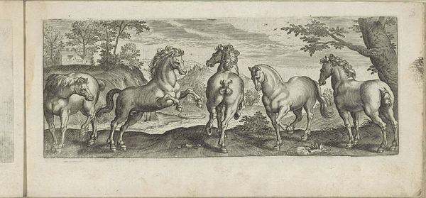 Curator: Here we have a remarkable engraving, "Apen, koe en buffel in een landschap," created in 1583 by Marcus Gheeraerts the Elder. Editor: It's certainly odd! A curious grouping of animals depicted in what looks like the middle of nowhere. There's a palpable sense of unease emanating from it. Curator: Indeed. Let’s begin with the technical aspects. Gheeraerts employed meticulous detail, evident in the precise cross-hatching which creates the tonal variations. Notice the textural differences he achieves between the fur of the animals and the smoothness of their hides. The composition has a horizontal emphasis with everything neatly arranged. Editor: Yet the spatial relations are strangely flattened, heightening the sense of artificiality. Why these particular creatures? Are the apes and buffaloes purely aesthetic choices? One could propose it speaks to the beginnings of early imperial encounters and taxonomic categorization during the Early Modern period, where new territories and species came into increasingly close proximity... represented, that is to say, in the microcosm of the composition. Curator: Possibly, but consider also the allegorical potential. The monkey figures were often symbolic, appearing in numerous works of this period. What reads as a simple landscape could, in fact, allude to complex moral narratives. Editor: While you analyze form and historical allegory, I see questions about our relationship with nature and how that's intertwined with social, historical, and perhaps violent encounters with "new worlds." The castle looming on the horizon…does it not signal a fortress of sorts, as civilization begins to encroach the wilds? Curator: It might suggest that, though I would want more visual support. Either way, it presents a fascinating case study in the function and representation of early engravings. Editor: Absolutely. It shows us that, even within what might appear straightforward on the surface, there lies an entangled world of narratives worth interrogating, both then and now.