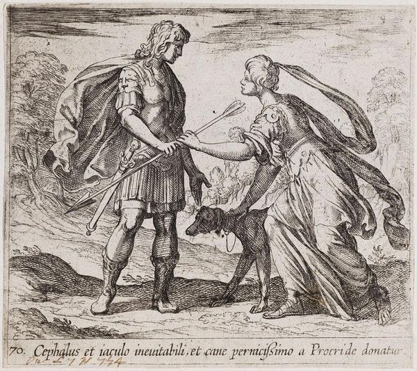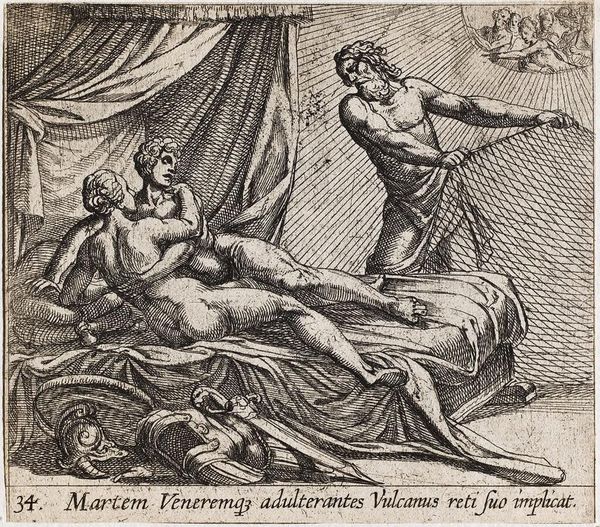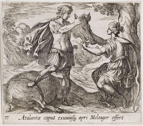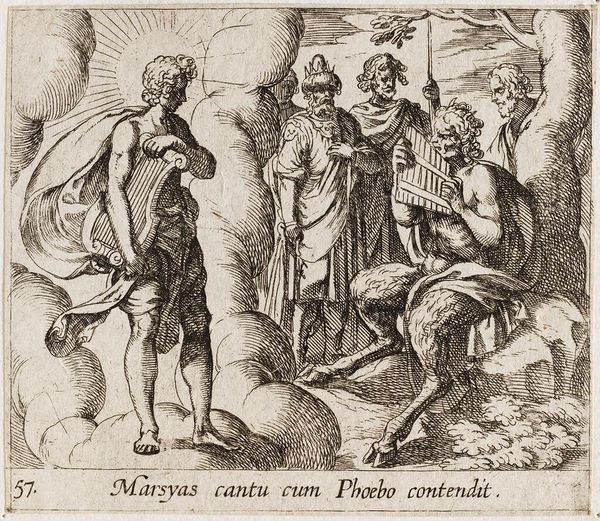 Editor: Here we have Antonio Tempesta's small engraving, *Apollo Killing Marsyas*. It feels brutal, yet distanced, as if we are watching a staged performance. What's your take on this scene? Curator: This work reflects the cultural fascination with classical mythology and the power dynamics it represents. Consider the public spectacle of flaying - a brutal punishment but also a demonstration of authority. How does Tempesta’s choice of engraving, a medium often used for dissemination, play into the broader understanding of power and knowledge? Editor: So, it's not just about the myth, but how the image itself circulates and reinforces ideas about authority? Curator: Precisely. The act becomes a lesson, visualized and distributed. It makes you wonder about the role of art in shaping perceptions of justice. Editor: That definitely gives me a lot to consider about how art serves power.