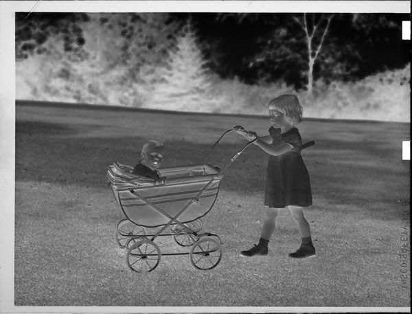 Curator: This captivating gelatin silver print, simply titled "Untitled (boy and girl riding tricycles)," is credited to Lucian and Mary Brown. It measures roughly 4x5 inches. Editor: It's oddly melancholic for an image of children. The stark tonality and simple composition create a sense of isolation. Curator: Indeed. The image reads as a social commentary on childhood experiences, reflecting themes of innocence but also potential gendered roles. The tricycle becomes a symbol of limited autonomy, a stage before full independence. Editor: I see the tricycle as a symbol of transition, evoking childhood, freedom, and the beginning of a journey—the endless possibilities of youth. Curator: That’s a compelling counterpoint. Perhaps the beauty lies in the tension between potential freedom and societal constraints. Editor: Perhaps. This image has given me something to consider. Curator: Me too; I appreciate how the image challenges our assumptions about childhood.