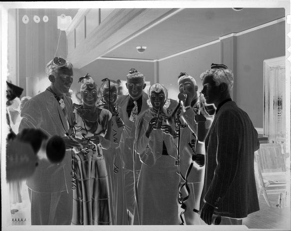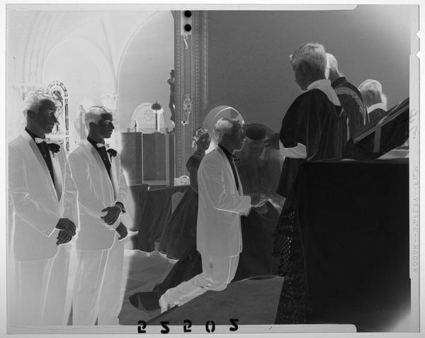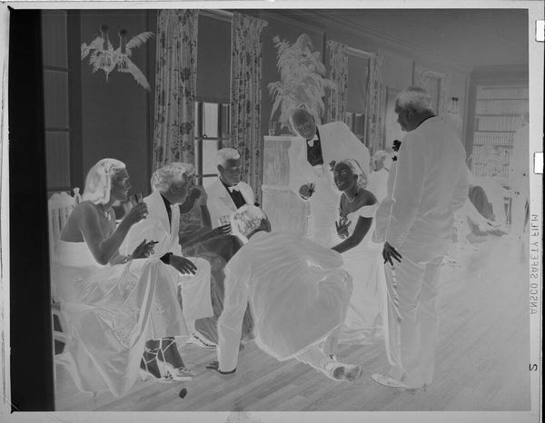 Editor: This photographic negative, "Untitled (guests at cocktail party)" by Peter James Studio, shows a gathering of formally dressed people. The high contrast and slightly surreal effect of the negative itself give it an eerie feel. What can you tell me about the context of such images? Curator: Well, the image's value resides not just in the scene itself, but in what it tells us about the social rituals of its time. Consider how photography, even casually done, was used to document and reinforce social hierarchies. How might access to such events or the ability to commission a photograph like this, reflect power dynamics? Editor: So, beyond the party itself, the photo signifies something about who was included and who was not? Curator: Exactly. It’s a historical artifact reflecting social norms and the politics of representation, even in seemingly candid moments. Editor: That gives me a lot to think about regarding the photographer's intention.