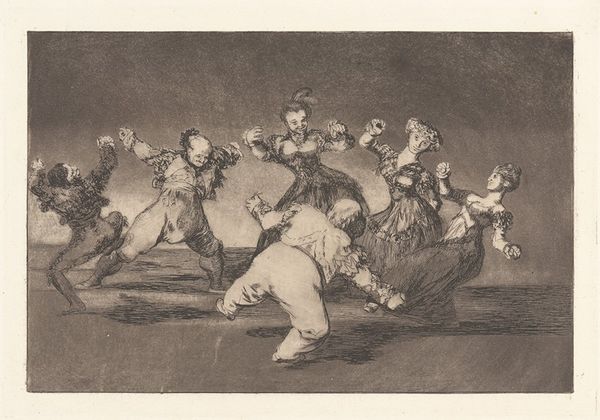 Editor: This is Goya's "After Vice Comes Fornication: Simpleton," held at the Harvard Art Museums. It feels like a chaotic nightmare, with figures emerging from the darkness. What kind of symbolism do you see at play here? Curator: Goya understood the power of archetypes. The central figure, almost clown-like, yet menacing, embodies a grotesque distortion of pleasure. Notice how the surrounding faces express anguish. What do they represent to you? Editor: Perhaps the consequences, the internal and external suffering caused by unchecked desires? Curator: Precisely. The print becomes a mirror reflecting the shadow self, the part of us we often deny. Consider how it resonates even today. Do we still grapple with similar themes of excess and its repercussions? Editor: It definitely makes you think about the cyclical nature of these struggles. Thanks, I never thought of it that way! Curator: The lasting power of visual symbols to convey the human condition is a testament to Goya’s genius.