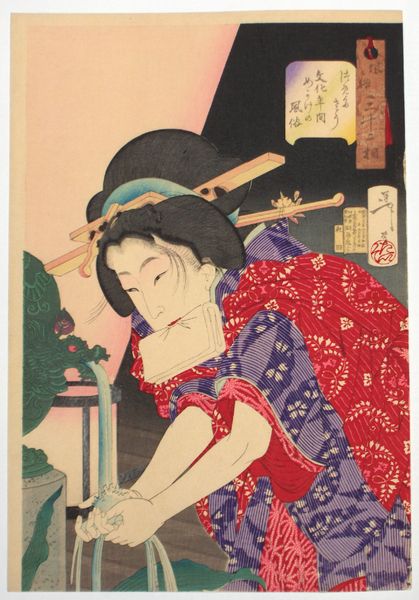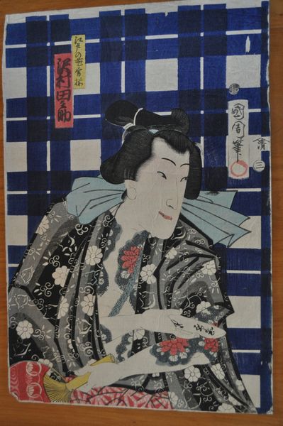 Editor: Here we have "Evening Bell at Muenji Temple- Actor Sawamura Tanosuke III as Yukanba Kozō no Kichiza," possibly created between 1865 and 1867 by Toyohara Kunichika. It's a Japanese Ukiyo-e woodblock print. I find it quite striking—the actor's intense gaze and the bold tattoos clash with the delicate paper lantern. What do you see in this piece? Curator: I’m immediately drawn to the materials and the production process. Consider the woodblock print technique itself—the labour involved in carving the blocks, the layering of inks, and the registration required to create these images. Each step is a conscious decision that affects the final product. Notice how the artist employs flat planes of colour and strong outlines. What does that production method suggest to you about the role of "originality" here? Editor: It makes me think about accessibility. Were prints like this mass-produced and available to a broader public than, say, a painting would have been? Curator: Precisely! These prints democratized art to some degree. Consider the context: these images weren’t just aesthetic objects, but also commodities in a burgeoning consumer culture. Ukiyo-e prints circulated widely, documenting popular culture such as Kabuki theatre. Now, consider the portrayal of the actor: how does the artist highlight Sawamura Tanosuke's skill and persona, and how might that elevate or blur the lines between high art and commercial product? Editor: That's fascinating. It makes me think about how this print, through its materials and production, both reflects and reinforces the popularity of the actor and the Kabuki tradition he embodies. Curator: Indeed! We move beyond the purely aesthetic, towards a deeper understanding of artistic production as labor and consumption. Editor: I never thought about ukiyo-e prints as part of a commercial system before. Now I'm much more interested in the work involved and how it reached such a wide audience. Curator: That’s exactly the point: to examine the tangible realities behind artistic creation, and to recognize its integration into the everyday experiences of the time.