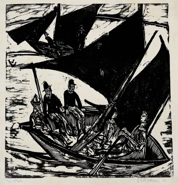 Editor: Here we have Pyotr Konchalovsky's "On the deck of the trawler," a graphite drawing on paper. There’s a real sense of industry here, watching these sailors working aboard the ship. I'm curious about what grabs your attention when you look at this piece? Curator: Initially, I'm struck by the dynamism achieved solely through the graphic elements. Notice how Konchalovsky masterfully uses lines - thick, thin, short, and long - to create both the robust structure of the trawler and the airy lightness of the sky. The lines of the rigging are very precise and clean compared to the softer textures of the clouds, really pushing this contrast. Editor: That makes sense. So the line quality itself carries a lot of the weight of the visual impact, it seems, not only illustrating elements but also creating the mood. Curator: Precisely. The vertical thrust of the mast is countered by the figures, and the clustered net below and, together with the intricate rigging, results in a highly structured yet active space. How do you interpret this interplay of tension and balance? Editor: I think I see a strong focus on labor, and capturing it as a powerful visual experience; a raw glimpse of labour instead of an idealisation of the experience of the sea. The emphasis on structural relationships definitely reinforces that message. Curator: It becomes, then, a compelling statement through form alone. The structural tension, rendered through line and composition, communicates this intensity. Editor: This formal approach really illuminated the drawing for me, offering a different angle on the visual language. Thanks! Curator: My pleasure; there's so much to discover by examining artistic choices so deliberately.