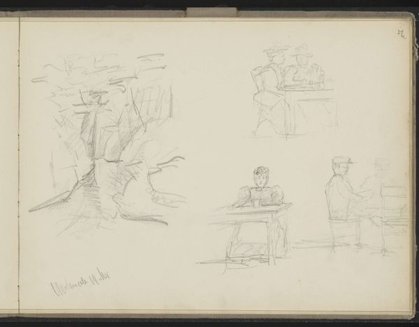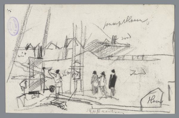 This pen drawing of a group looking into the distance from a boat, was created by Hans Borrebach. The composition is arranged with the figures in the foreground and the landscape in the background, creating a sense of depth. The drawing is dominated by linear strokes that construct a scene viewed from a low angle. Borrebach uses line to create a separation between the figures in the boat and the distant landscape. The lines are economic, yet they describe form and texture. There is a tension between the detailed rendering of the boat's structure and the more ephemeral depiction of the figures. This suggests a thematic contrast between the material world and human experience. The boat, with its rigid lines and right angles, is an exploration of structure, while the organic forms of the group introduce an element of disruption. This contrast can be viewed as a semiotic device, where the boat represents order and the figures embody the uncertain nature of human perception. The drawing destabilizes the concept of a fixed viewpoint, offering instead a fluid interpretation.