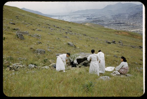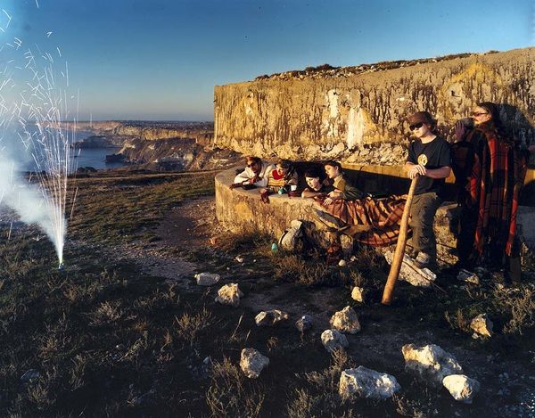 Curator: At first glance, this piece offers a strange yet compelling tableau of figures in a landscape. The formal arrangement strikes me with its surrealist touch and calculated discordance between elements. Editor: Well, indeed! This is "Angels" by Arsen Savadov, a photographic performance work created in 2000. The title promises ethereal grace, yet it stages a somewhat incongruous scene upon this pebbled beach. It evokes a sense of displacement and disruption to the expected. Curator: Precisely. The figures adorned with mismatched wings become focal points against the harsh textures of the beach. The artist uses a cool color palette, which creates a strangely dreamlike atmosphere. Semiotically, we might question what "angelic" representation aims to achieve. It invites us to dissect meaning—to decipher codes beyond surface appearance. Editor: It feels more grounded, literally. Looking at this work historically, the performance element really anchors it in a contemporary art world fascinated by identity and performativity. Savadov situates the performers within a very particular historical context too: in this beach scene, that brings in references of both displacement and utopia, which may challenge our notion of angels as symbols of solace. The wings' vibrant, unnatural coloring heightens their artifice. Curator: Undoubtedly. There's tension in this manufactured appearance; its contrast begs viewers to negotiate their own readings— perhaps probing notions of authenticity. Furthermore, Savadov strategically controls the perspective within the two-dimensional plane through thoughtful placement to create an open arena of investigation. Editor: In truth, perhaps Savadov's figures point towards more complicated dialogues related to our understanding of faith or ideals, in our contemporary moment and its ever increasing complexities. A powerful image, indeed, that makes us ponder questions without easy answers.