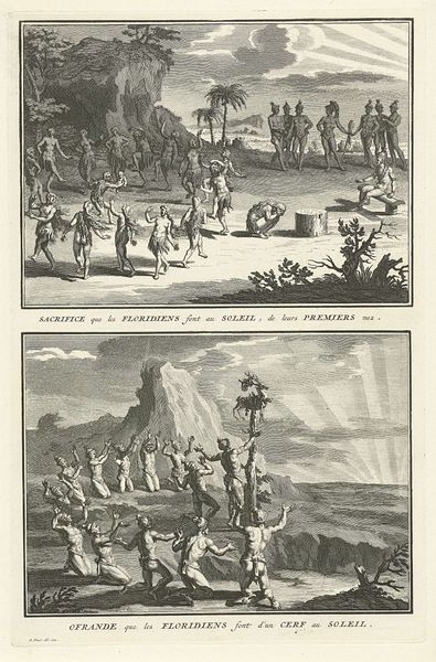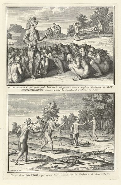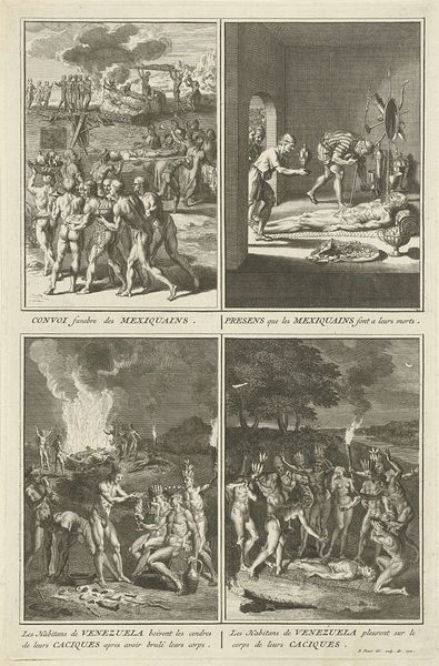 Bernard Picart created this print, titled 'Voorstellingen van rituelen te Pegu,' which translates to 'Representations of Rituals in Pegu’. Pegu, now known as Bago, is a city in Myanmar. The prints offer glimpses into the cultural practices of the Pegu people, seen through the lens of an 18th-century European artist. The upper panel appears to show a water festival, while the lower panel depicts funeral ceremonies for their deceased king. Reflecting the era's colonial attitudes, Picart's work presents a Western interpretation of non-Western rituals. This representation invites us to consider the power dynamics inherent in cross-cultural depictions and the potential for misinterpretation or exoticization. While the image provides a historical record, it also prompts reflection on the complexities of cultural exchange and representation. What stories might these rituals tell from the perspective of the Pegu people themselves?