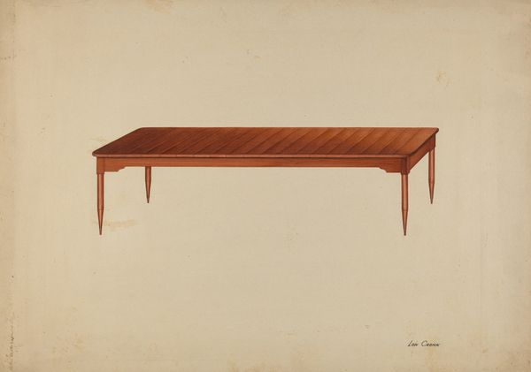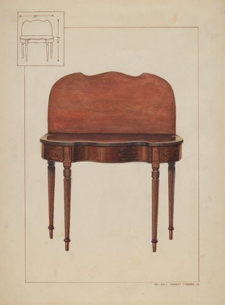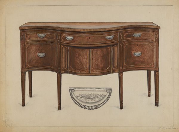 Cornelius Frazier made this drawing of a circular desk, we don’t know exactly when. The color palette is warm and inviting, focusing on various shades of brown to capture the rich tones of the wood. I’m interested in Frazier's commitment to the process, emphasizing the labor and skill involved in furniture design. I particularly notice the tabletop, which curves gently. You can almost feel the smoothness of the surface, imagining the way light would play across it. The drawers are rendered with such care, each line precise. The shadows and subtle highlights add depth, making them feel almost three-dimensional. It reminds me of the work of Josef Albers, who explored color relationships through simple geometric forms. Just as Albers sought to reveal the complexities within seemingly basic compositions, Frazier uncovers the beauty and potential in everyday objects. It's a reminder that art can be found in the most unexpected places.