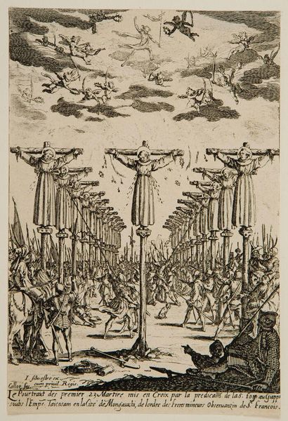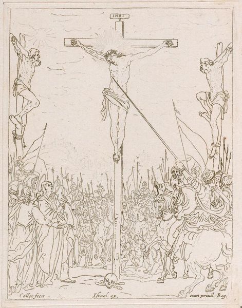Editor: This is Jacques Callot’s "Christ Wounded by the Lance," a small etching. It's incredibly detailed, and the scene feels both chaotic and meticulously constructed. What strikes you most about it? Curator: I'm drawn to the physical labor involved in creating such detail on such a small copper plate. Consider the socio-economic context: who commissioned it, and for what purpose was this labor and material deployed? Editor: That’s fascinating. It never occurred to me to think about the means of production of such a historical piece. Curator: Exactly! How does Callot's technique reflect the social structures of his time and the consumption habits of his patrons? Editor: I see now how thinking about materials and production adds another layer to understanding the artwork itself. Thanks!