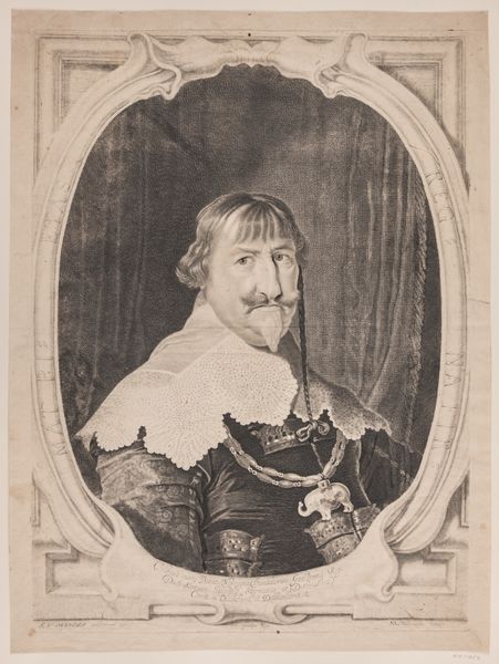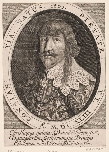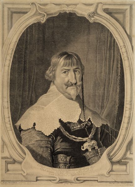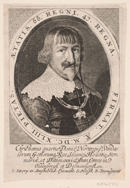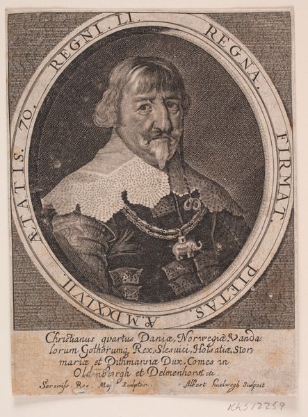Curator: This engraving presents Christian IV, the King of Denmark and Norway, rendered between 1643 and 1647 by Albert Haelwegh. Immediately, the texture of the piece captures the eye. Editor: There’s an almost unsettling starkness in the lines; despite the regal subject, it’s anything but flattering. The intense detailing in his collar almost competes with his face, making me focus perhaps inappropriately, on those heavy lines around his eyes. Curator: Precisely! And those lines are key to the visual language. As a print, this work would have been disseminated widely. Consider how such portraits functioned within the political sphere – asserting power and conveying authority to a broad audience. Editor: But what kind of power is being projected? His features appear almost… cartoonish, verging on grotesque. I’m immediately questioning whose interests are truly served by *this* particular portrayal, and in whose eyes. There’s a tension between grandeur and vulnerability, I feel. Curator: Interesting, the grandeur is definitely there, if subtly so. Consider his attire—the elaborate lace collar, the chain of the Order of the Elephant—each element meticulously engraved to showcase the king’s status. These symbols are inherently tied to the social structure of the time, the rigid hierarchy upheld through visual representation. Editor: That Order of the Elephant, it’s meant to signal importance but ends up almost as satire. The scale seems off, don't you think? It emphasizes the strangeness of the man, and perhaps hints at anxieties around his reign. What are the visual cues suggesting about Christian IV's rule during this later stage? Curator: Yes, indeed. During this period, Denmark was involved in the Thirty Years' War, and while he aimed to solidify Denmark's position as a major European power, his policies led to considerable debt and conflict. The print does not overtly critique, but it’s made and viewed within this specific historical and socio-political context. Editor: That’s key – how artistic choices are never truly neutral, they are borne out of a messy blend of intention, access, and the prevailing sentiments of their time. I find this makes viewing art such as this far more rewarding, even if challenging, than a surface perusal can reveal. Curator: Agreed. Understanding the era, its power structures, and how they influenced art production opens up the work to far more nuanced readings. Editor: Right. It forces us to question not just what we see, but *why* we see it that way, and who benefits from that vision.