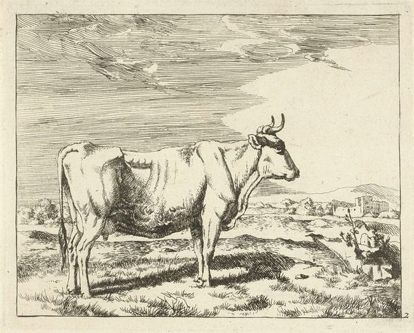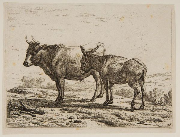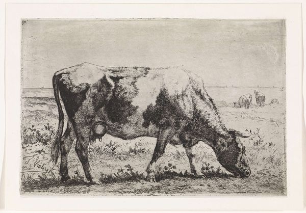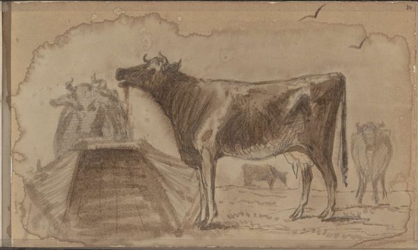 Editor: This pen and graphite sketch, "Schaap naar links," by Wouter Johannes van Troostwijk, dates back to between 1792 and 1810 and is currently held at the Rijksmuseum. The way the sheep is rendered, almost lost in the vastness of the landscape, gives it such a peaceful mood. What's your take on it? Curator: The sheep here acts as a symbol. Consider the broader social context: late 18th-century Holland, amidst political and economic shifts. Rural imagery gained traction, not just as aesthetic appreciation, but also reflecting societal values, namely ideas about 'national character' which often meant rural labor. Editor: So the sheep represents…Holland? Curator: Not exactly. Think of how livestock were being represented and consumed at that time. Van Troostwijk is very likely capturing, through this animal, the spirit of idealized, pre-industrial labor. The very act of sketching, rather than a formal portrait, signals a shift. Note the quick, assured lines: what does that say about the market for art during this period? Editor: Hmm, like art was becoming more accessible? And quick sketches catered to a different kind of buyer? Curator: Precisely. The piece operates within, and perhaps even anticipates, the evolving socio-economic structure surrounding the production and reception of art. Its meaning isn't simply "sheep in a field". It tells us how art reflects a period. Editor: I never would have thought about it that way. Seeing the connection between art and wider changes in society gives it new dimension. Thank you! Curator: Indeed, examining this connection illuminates much of our understanding. It is the politics of imagery, after all.