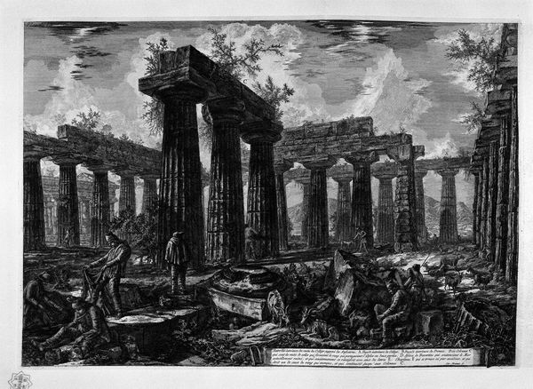 Curator: Let’s take a look at Giovanni Battista Piranesi's print, “Inside the same building." Editor: Whoa, that’s intense. Like stepping into a dream—or maybe a beautifully rendered nightmare? It’s all black and white, giving it this haunting quality. So many columns, so much…grandeur, turned to ruin. Curator: Piranesi, of course, known for his detailed etchings, presents a layered meditation on time, architecture, and the weight of history through printed images. The ruins depict an imagined Rome, filtered through observation, archaeology, and imagination. Notice the figures he has inserted - those people with the animals, giving scale to the space, while the use of light highlights the surface and texture of the decaying material. Editor: They look like tiny ghosts wandering amidst giants! For me, those dark masses and dramatic shadows, achieved through his printmaking process, create this feeling of…overwhelmingness. Are we supposed to feel small, dwarfed by these remnants? Or maybe pity for them? Curator: Piranesi was very interested in the process of etching and engraving, the line work giving you texture to describe the crumbling materials of these huge temples, using his skill to explore classical form through a romanesque lens. It definitely makes one think about power and its impermanence, how even the most ambitious building project is still bound by the materials that compose them. Editor: True, the materials will return to earth. I see the artist using the landscape format, emphasizing that time and landscape both act on form. These columns appear both strong and delicate at the same time, somehow. Curator: His cityscapes definitely capture a mood—a palpable tension between the past's ambition and the present's decay. Editor: A very thoughtful comment; Piranesi creates what I think is a melancholic echo of architectural achievement. Curator: Precisely. The conversation we've had underlines the piece’s rich engagement with history and its making. Editor: I can agree with that: his technique, especially within the realm of printed image, allows a reflection on both memory and material decay. It gets the viewer wondering about humanity.