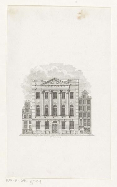 Curator: Before us, we have Jean Théodore Joseph Linnig’s “Huis van het lakengilde op de Grote Markt in Antwerpen,” an etching from 1868, which depicts the Cloth Guildhall on the Grand Square of Antwerp. Editor: The first thing I notice is the intricacy; all those lines create such detail. There is an austere, almost solemn feel about it, and the symmetry of the building draws you into it, despite the grey rendering. Curator: The Cloth Guildhall was more than just architecture; it was a center of economic and social power for the city’s textile merchants. Its prominence on the Grand Square underscored its central role in Antwerp’s identity, but Linnig captures more than a facade; he presents a symbol of trade and civic life in Belgium. Editor: You know, guilds themselves were powerful symbols, representing solidarity, mastery, and regulated access to economic opportunities. This building then visualizes and legitimizes that authority. Do you see any symbolism within the building that hints at these different roles? Curator: Absolutely! The regularity of the windows, perhaps subtly nodding toward ideas of standardization and industrious labor within each floor of that guild house. I wonder how deliberate Linnig’s decision was to keep the doors closed and the inhabitants absent. That decision reinforces our understanding of economic isolation and privilege within society at this time. Editor: It is a powerful study in how visual language shapes perceptions of social structures. Curator: It’s fascinating how an etching, with its seemingly limited tonal range, can still convey such depth and commentary about the societal and historical landscape of the 19th century. It highlights the stories etched into the very fabric of urban spaces. Editor: It makes you appreciate the narratives that objects carry, beyond what appears immediately visible. Each of the small components is a brushstroke to reveal the symbolic narrative imbued in this Guildhall image.