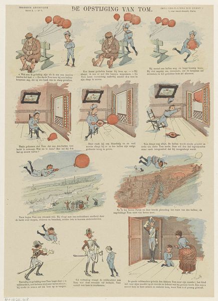 Editor: This print, "De geschiedenis van ridder Paul," made sometime between 1869 and 1888 by J.H. van Wees, depicts a sequence of events in watercolor, pen, and ink, almost like a comic strip. I’m immediately drawn to the composition—the circular vignettes set against the neutral background. How would you interpret this work from a formalist point of view? Curator: Intriguing, isn't it? If we strip away the narrative, which seems dominant at first glance, what remains? Look closely at the geometry at play. The artist employed circular frames to contain each scene and create a repetitive visual rhythm. Note how that shape is echoed in the helmets of the figures, softening the implied militarism of the garb. What effect does the circular motif create here? Editor: I suppose it creates a sense of unity across the scenes, and also confines each event, separating it from the rest of the "story" perhaps? But what about the choice of watercolor? Curator: Precisely. Watercolors lend themselves to the depiction of atmosphere and texture. Notice how van Wees used it in concert with pen to achieve clarity but also allow for subtleties of light and shadow within each frame. Moreover, consider the use of printmaking here: what significance might you ascribe to the distribution of such images among the Dutch populace? Editor: Well, printing allowed art to reach a much wider audience than painting would. So by choosing print, the artist's was emphasizing popular distribution, reaching lots of households with children. It is fascinating to consider those implications in relation to semiotics! Curator: Indeed! By reducing these pictorial elements to their component structure, while being alert to popular sentiment, we start to uncover underlying structures of meaning within this ostensibly simple narrative. Editor: This reframing has given me a new lens through which to look at sequential art forms. Thanks!