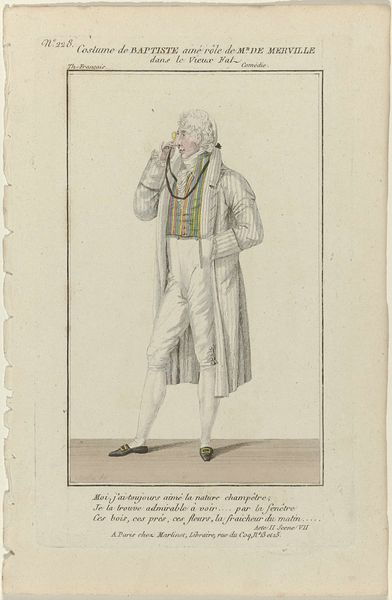 Pierre Maleuvre created this print, Petite Galerie Dramatique, sometime between 1796 and 1843. It is rendered with delicate lines and a muted color palette. The figure dominates the composition, a study in theatrical flamboyance. The subject's extravagant attire and exaggerated pose immediately draw the eye. Observe how Maleuvre uses line and color to define the character’s attitude and persona. The bold, contrasting colors highlight the figure's dramatic stance, while the subtle use of shadow adds depth and volume. This print captures the performative nature of identity. In a world where appearances could shift perceptions, Maleuvre presents us with a figure embodying both authenticity and artifice, inviting questions about what constitutes genuine expression versus mere spectacle. Maleuvre's work serves not only as a portrait but as a mirror reflecting society's complex relationship with image and identity.