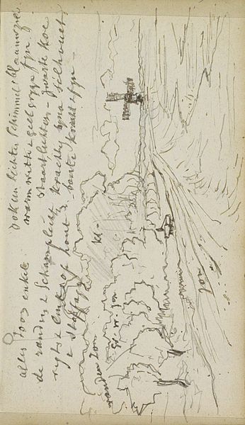 Johannes Tavenraat made this landscape drawing with pen in the Netherlands, sometime in the mid-19th century. The sketched lines and washes depict a somewhat indistinct landscape with buildings. The image gains meaning through its connections to the artistic culture of the Netherlands, known for its detailed landscapes and careful attention to light. During this time, Dutch artists were part of a broader European movement focused on accurately portraying nature. They were also interested in how landscapes reflected national identity. Tavenraat’s notation regarding the colour in the image could tell us something about the importance of accuracy in representation. To understand this drawing more fully, we might research the artistic conventions of landscape art in the Netherlands. We could also learn more about the sites Tavenraat depicted and what they might have represented to viewers of his time. By considering this information, we can better understand the historical significance of this artwork.