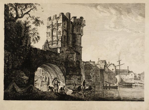 Editor: Here we have Robert Adam’s “Architectural fantasy with an antique bridge over a river, and a watermill in the foreground,” made in 1777 using ink. The grayscale tones and ruined architecture give it a very dreamlike, almost melancholic feel. What stands out to you when you look at this drawing? Curator: The bridge looms large, doesn't it? Not merely as a physical structure, but as a symbol. Bridges connect, they represent transitions, passages from one state to another. And observe the ruined state - it speaks to the impermanence of even the grandest human endeavours. Do you get a sense of memory, perhaps the fragments of a forgotten empire, embedded within it? Editor: Absolutely, the ruins really evoke a sense of the past, but there's a strange blend of decay and idyllic life here with the figures relaxing in the foreground, next to a working watermill. Curator: Precisely! And consider the watermill – an emblem of industry, lifeblood of a community. Juxtapose it with the decaying grandeur above. Adam seems to be suggesting something about the cyclical nature of civilizations, the interplay between innovation and nostalgia, doesn't he? Editor: It's a powerful contrast, like progress built on the bones of history. The figures almost seem oblivious to the crumbling architecture. Curator: Or perhaps, they've integrated that history into their present. Think of it as cultural memory made tangible, part of their everyday. Do you notice how Adam uses the landscape itself to soften the starkness of the ruins, weaving nature and civilization together? Editor: Yes, the romantic, idealized landscape certainly counterbalances the severity of the architecture. I hadn't considered the 'cultural memory' aspect so explicitly. Curator: Visual symbols operate on many levels, from the obvious to the deeply ingrained. This piece beautifully layers those meanings, making us reflect on time, change, and the human spirit. Editor: Looking at it with your perspective in mind really shifts the focus from simple decay to something more profound about cultural persistence and adaption. Thanks for your insight!