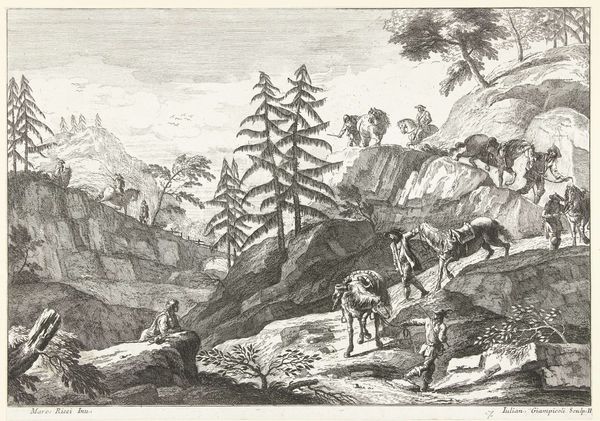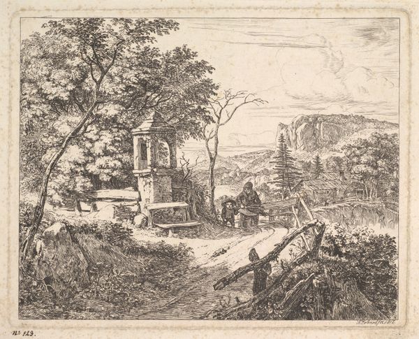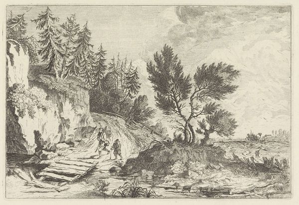 Curator: This is Allart van Everdingen's "The Horseman on the Stone Bridge," dating from sometime between 1621 and 1675. It’s an etching, currently housed in the Metropolitan Museum of Art. Editor: This is quite a detailed landscape! It feels a little precarious with the bridge in disrepair. The textures created by the etching process are interesting. How do you approach a work like this? Curator: Well, the materiality of this etching is key. Consider the social context of printmaking in the Dutch Golden Age. These weren’t unique art objects in the way we think of paintings today. This was reproducible and was relatively cheap for consumption. What do you think that affordability signifies? Editor: So, owning art like this etching made it more accessible to people of different economic backgrounds during this era. Curator: Precisely. Instead of focusing on the grandeur of the scene, think about the labour involved. Etching requires a specific set of skills and access to tools, acids, and metal plates. The level of skill and craftsmanship required, made the reproduction of similar scenes or images cheaper over time. Editor: That makes me appreciate the artist's technique much more. Considering its place in society, how it circulated changes the work! Curator: Absolutely. It moves us beyond the individual artistic genius to an appreciation of art's role in a wider economic system of production and circulation. Editor: I hadn't considered the economics and consumption side of art from that period. Thanks, I've learned a lot about art's reach at this time. Curator: And I've enjoyed considering Everdingen’s place in that network!