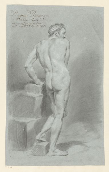 Editor: Here we have Benoit Louis Prevost's "Design: Figure from Encyclopédie," created between 1762 and 1777. It's an engraving and etching on paper. I'm struck by the figure's pose; it's almost confrontational yet vulnerable at the same time. What catches your eye about this work? Curator: The articulation of form through line and the manipulation of light and shadow are primary. Note the subtle variations in the hatching which delineate musculature and suggest depth. How would you describe the figure's relationship to the picture plane? Editor: I see the figure placed centrally, almost isolated by the negative space around it, making the body itself the sole subject. The artist obviously directs my gaze to study the figure’s physique, line, form and shape. What would you add? Curator: Precisely. The engraver’s meticulous approach translates into a formal exercise. We can see Academic artistic conventions at play in how the subject’s anatomy, while slightly abstracted, echoes ideals of Neoclassical order through careful study of shape and light. Consider how line weight impacts your perception of volume; where do you see effective use of contrast? Editor: It looks like he or she places the contrast across the back and upper leg areas to accentuate the muscle and create the form we’re examining. I guess I didn’t expect to find so much to appreciate from something created as a guide! Curator: It's a testament to the power of line and form, isn't it? The purely formal reading provides access to consider Academic intent and process. Editor: I’m now thinking differently about the plates within encyclopedias; they can offer insight into not just the subject matter, but artistic style. Curator: Exactly. It proves rewarding to carefully investigate the formal and technical aspects of artwork across genres and types.