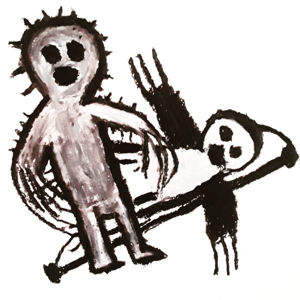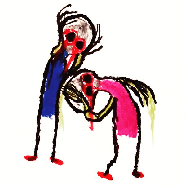 Curator: Thomas Riesner created this untitled ink drawing in 2019. The bold lines and raw energy are quite striking, wouldn’t you agree? Editor: Absolutely! My first reaction is a kind of visceral discomfort. The crude figures, the drips, the suggestion of violence... it's deeply unsettling. It brings to mind the idea of power imbalances, specifically how they’re perpetrated. Curator: The composition certainly contributes to that. Notice the hierarchical arrangement – one figure towering over the others, almost enthroned upon them. Consider also the use of line; it’s not just descriptive, it’s expressive. See how the varying thickness and direction create tension? Editor: Precisely. And I’d also point out the use of color. The stark contrast between the blood red and the muted grays and blacks. It's an injection of trauma. Think about what red represents in different social contexts - blood, of course, but also danger, warning, and rage. The blue worn by the dominant figure provides another layer of political suggestion. Curator: It is interesting how those three tones carry so much of the piece's affect. The seeming spontaneity is deliberate. We should acknowledge that within Expressionism, this "naïve" style, particularly as a commentary, actually aligns it with practices of transgression. The ink as a medium also allows for a fascinating immediacy – there's little room for error, so each mark feels incredibly potent. Editor: It reminds me, too, of abject art—art that explores themes of degradation and repulsion, forcing us to confront the darker aspects of human experience. Think about artists like Paul McCarthy, who used similar raw aesthetics to challenge social norms and power structures. Curator: I can see the connection to McCarthy's abject aesthetic, but Riesner employs a more streamlined, almost graphic style, and his color scheme also is restricted to just those few distinct tones. Editor: Restriction in service of impact is powerful, certainly. I'm left thinking about who this figure represents and how such expressions might relate to trauma both inflicted and endured. Curator: The tension between that visceral immediacy and the symbolic arrangement is something I’ll continue to contemplate, especially concerning the act of witnessing power in this raw style. Editor: For me, it reinforces the power of art to expose the hidden or overlooked dimensions of our social and psychological realities.