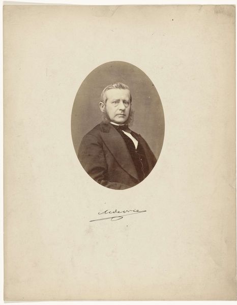 Curator: This daguerreotype from somewhere around 1860 and 1864 is entitled "Portrait of L.G. Pareau, Professor in the Faculty of Theology at the University of Groningen", and it's signed by Johannes Hinderikus Egenberger. What's your initial reaction? Editor: It feels austere. The man's stern gaze and the monochromatic tones definitely project a sense of gravity appropriate for a theologian of the time, but there is something else happening. Curator: It would be difficult to overstate the shifting cultural and political landscapes during the mid-19th century when Egenberger captured this image. Photography itself was challenging established traditions of power, of seeing, of recording, in favor of an increasingly democratized perspective. How do you see it influencing the narrative in this image? Editor: The most prominent emblem is his cross or star-like medallion worn on his coat; in tandem with his neatly combed hair, it anchors him as a pillar of established society. While the photograph is in some sense groundbreaking, the artist, or perhaps the sitter himself, consciously chose symbols and modes of presenting to highlight tradition. Curator: Indeed. Egenberger likely recognized how photography, though a technological marvel, could perpetuate existing hierarchies. A theological professor's portrait in the style of realism solidified his societal position but it could also threaten tradition as this photo is technically reproducible. Editor: You can see this tension embodied in the photograph’s composition too. Look at the delicate hand-drawn frame, which hints to the desire for timelessness while holding an innovative, easily duplicated photographic process. It feels caught between the old and new. Curator: And think about Pareau himself. As a professor of theology, he held considerable social and intellectual power within his community. His stance here, captured in this relatively new medium, suggests a negotiation— a desire to embrace modernity while safeguarding the sanctity of established knowledge. He becomes an interlocutor between tradition and innovation. Editor: Looking at the photograph now, I notice both Pareau and Egenberger operate on such self-conscious levels of performance. From the slight blurring due to longer exposure times to the angular picture frame surrounding the picture, I feel that everything in the photo symbolizes transition. Curator: Agreed, a compelling synthesis. We see, ultimately, how this early photograph is both a product of its time and a commentary on the societal shifts that defined it, embodying a subtle tension between holding onto power and embracing change.