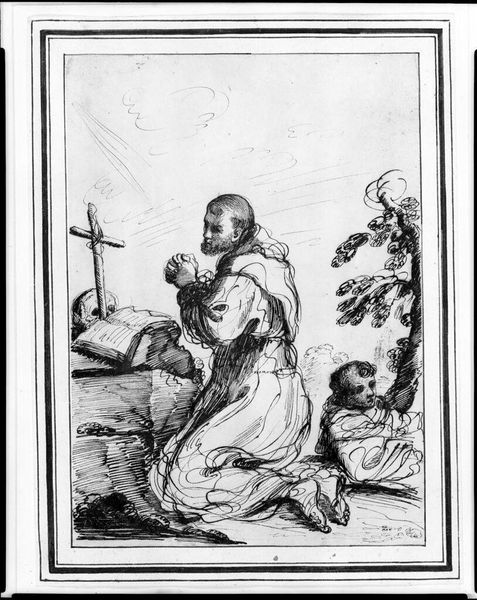 Editor: This is Giovanni Battista Piranesi's engraving, "St. Francis in Prayer." There's a real sense of drama here, a kind of theatrical piety. An angel hovers above St. Francis as he kneels in prayer beside a skull, a crucifix, and an open book. The detail is incredible. What compositional elements stand out to you? Curator: Note the strong diagonal lines, Editor, particularly in the angel’s wings and St. Francis's posture, which pull our eye upward. Consider how the composition guides our eye through symbolic objects such as the skull which serves as a memento mori, that all things must pass. Editor: So, you're suggesting it's not just about religious devotion, but about reflecting on our own mortality? Curator: Precisely. And consider the open book opposite of it; could that be an expression of a potential freedom from that memento mori? And beyond these narrative considerations, examine the textures created by the hatching and cross-hatching. How does Piranesi use these lines to describe form and space? Editor: I see what you mean. The light seems to be catching the angel's wings in a way that highlights their texture. What about St. Francis's rope? How does it function compositionally? Curator: Its circular nature draws the eye back into the scene and is contrasted by the diagonal emphasis, binding the scene. Furthermore, it could also serve to denote St. Francis's piety or some element of sacrifice. But what could be the significance of this formal juxtaposition? Editor: Maybe it reflects the tension between the temporal and the eternal? It makes me consider how Piranesi can make a fairly familiar religious scene seem so striking. Curator: Precisely! It highlights his masterful skill to emphasize the value of not only devotion to technique but conceptual consideration when studying the art piece. What you see on the surface alludes to so much more!
