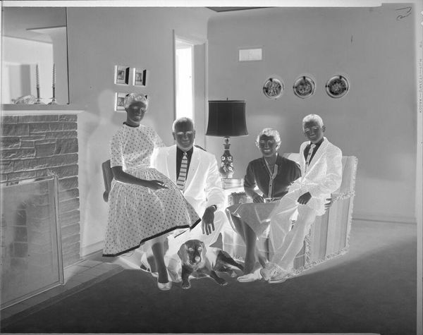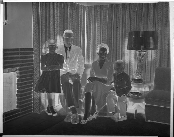 Curator: This photograph, attributed to Lucian and Mary Brown, is simply titled "Untitled (man and woman on chairs, people standing behind)." It’s a modest 10 by 12 cm print housed at the Harvard Art Museums. Editor: It feels like a faded memory. The inversion of tones lends a spectral air to the wedding party, unsettling yet somehow touching. Curator: Indeed, the negative's materiality emphasizes the photographic process itself. Who were these people, what was the labor involved? How does the image reflect social conventions? Editor: It's a poignant reminder of the ephemeral nature of such occasions, as fleeting as a photographic exposure. Curator: Perhaps. It prompts reflection on image making, family, and memory. Editor: Yes, even the simple act of viewing becomes an act of remembering, or imagining, histories unknown.