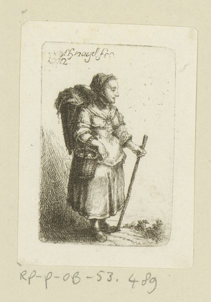 G. Douglas made this print, “Tibetan Gypsy Woman”, sometime in the 20th century, likely using etching and aquatint. These are printmaking processes involving coating a metal plate with wax, drawing an image through it, and then bathing the plate in acid. The etcher’s art lies in controlling the depth of the line through the amount of acid exposure. This print is also selectively colored, perhaps using watercolor washes. Look at the figure’s clothing, and the large basket she carries on her back; it's as if the printmaker has sought to render the textures of woven fabric, fur, and wicker. We might consider the labor involved in producing the print, as compared to the labor implied within the image itself. The woman appears burdened, but also resilient. She relies on the basketry to carry essential supplies for her journey. This print offers a glimpse into a particular moment, but it also prompts us to consider a much wider scope of activity and experience, as we consider it’s materiality.