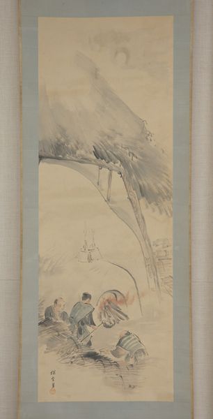 Curator: Let's discuss "Making Ceramics", a painting rendered in watercolor. The artwork comes to us from Eiraku Hozen and is estimated to have been completed sometime between 1800 and 1854. Editor: Its airy quality is quite striking, isn't it? The restrained palette and delicate brushstrokes create a serene, almost ethereal atmosphere. The figures seem to exist in a world softened by light and water. Curator: Indeed. Hozen's choice of medium and the loose handling of the pigments greatly contribute to the mood. Notice how the artist constructs spatial depth using layered washes, creating an atmospheric perspective, yet one that lacks precise spatial relationships. Editor: This work is incredibly revealing about ceramic production during that period. It almost acts as a piece of social documentation, revealing production methods of workshops that supported art, commerce, and a local labor force. I wonder about the intended audience of these types of figural pieces that appear to represent daily labor? Curator: Absolutely. Considering this as social commentary enhances the image's potential meanings. Still, one can argue the function is primarily pictorial—with an intention to showcase artistic skill—as we analyze the organization of line, form, and color within its pictorial space. What do you observe regarding the rhythmic placement of shapes and the variation in tonal values? Editor: Perhaps what draws my attention is how "art for art's sake" developed differently in varied cultures during the 19th century, with Asian artists producing objects that appear visually focused, while simultaneously embodying an illustrative purpose, unlike some developments we see among their European counterparts. The subdued colors and soft edges contribute to a cohesive visual experience, even while depicting a bustling work environment. Curator: In this environment the shapes and the play of light and shadow are carefully orchestrated to lead the viewer's eye through the scene and across the surfaces of forms, to ultimately construct visual harmony, don’t you think? Editor: Undeniably. But recognizing its place within Japan’s aesthetic and economic history helps explain its dual commitment to beauty and function. Curator: Precisely! Together, our approaches unlock deeper dimensions of "Making Ceramics", enriching our understanding. Editor: A truly collaborative revelation. This helps inform and engage contemporary perspectives!