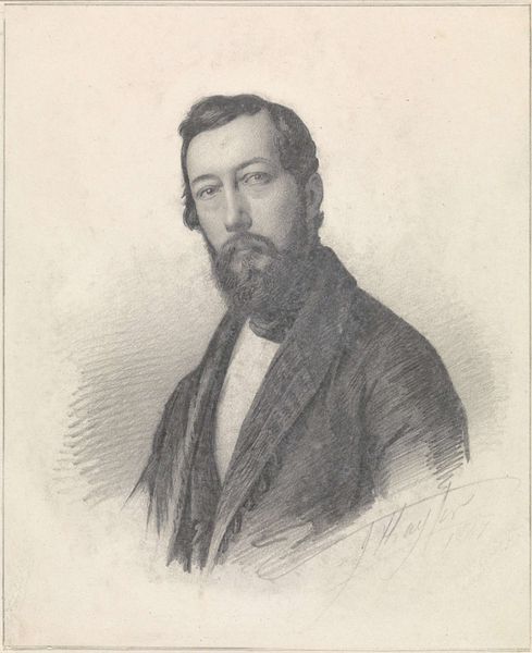 This is an anonymous portrait drawing of Laurent Joseph Hart at the Rijksmuseum, whose dimensions barely exceed that of a postcard. The artist used graphite pencil to render Hart’s likeness, employing soft, diffuse lines that coalesce to form a coherent, though not overly detailed, representation. The composition is structured by the subject's pose, arms crossed, which creates a sense of intimacy, drawing us closer to the sitter. This informal arrangement destabilizes the conventions of formal portraiture, inviting a more personal engagement. The delicate hatching technique provides a tonal range which models form and texture. In the context of the artwork, this technique can be interpreted through a semiotic lens as a sign of spontaneity, reflecting the rise of individualism and the valuing of personal expression. This emphasis on immediacy challenges traditional notions of representation. While the artwork appears simple, the underlying intellectual currents resonate with broader cultural shifts. Ultimately, the drawing invites ongoing interpretation, reflecting the transient nature of meaning.